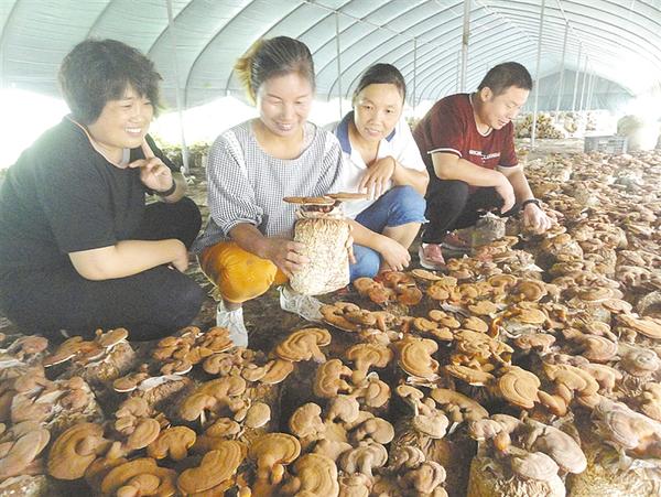 9月15日,商水县黄寨镇杨营村“蘑菇王”杨秀丽(左二),在扶贫产业园向种植户传授灵芝管理技术。近年来,黄寨镇采用“合作社+基地+贫困户”的模式,集种植、加工、销售为一体,加快推进食用菌全产业链开发,带动300多人实现脱贫致富。 乔连军 摄