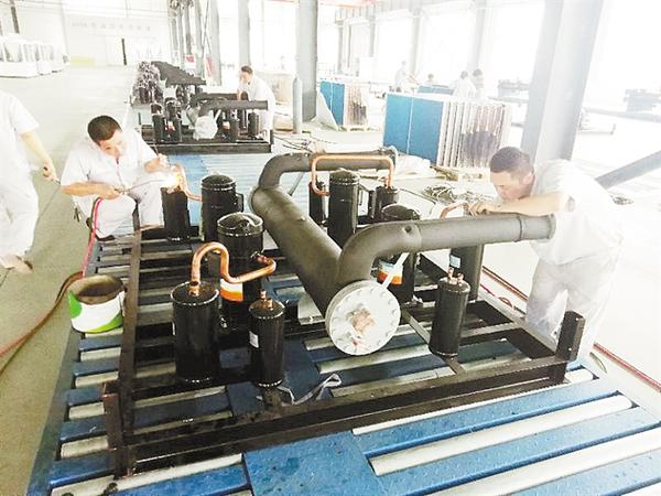 项目建设关乎经济发展、关乎民生改善。近年来,淮阳区坚守“大上项目、上大项目”的发展理念,坚持“一观摩、二办公、三督查、四报道”的项目推进机制,确保项目早开工、早建成,为经济高质量发展注入新动能。图为在位于产业集聚区的河南春新环境科技有限公司中央空调生产线上,工人正在焊接设备。记者 侯俊豫 摄
