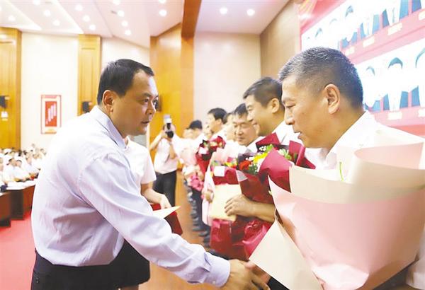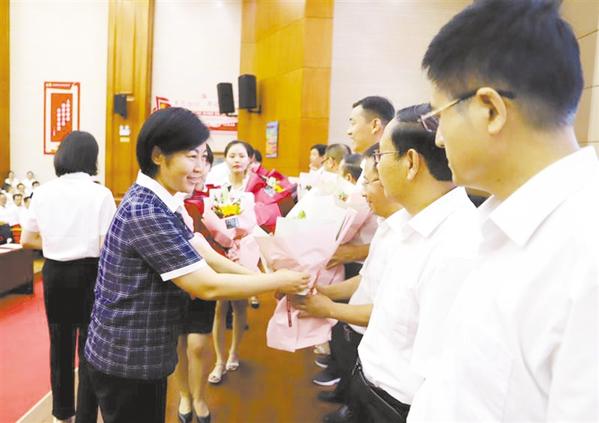 9月8日晚,郸城一高以“新理念开启办学新格局、高标准推动发展高质量”为主题,召开庆祝第36个教师节表彰大会。市人大常委会副主任、郸城县委书记罗文阁,县长李全林,县人大常委会主任李建军,县政协主席王伟县四个班子领导出席表彰大会,与郸城一高师生共庆教师节,送来党和政府的祝福与关心,寄望郸城一高再创辉煌、再立新功。刘成章代表郸城一高全体师生向罗文阁赠送鲜花,并承诺郸城一高一定向县委、县政府和全县人民交出更加优异的答卷。记者 徐松 摄