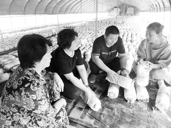 9月22日,商水县黄寨镇杨营村“蘑菇王”杨秀丽(左四)向蘑菇种植户传授蘑菇种植技术。杨秀丽在当地人大、工商联帮助下投资200多万元创建食用菌产业园,不仅自己获得较好的经济效益,还带动当地200多名蘑菇种植户和贫困户致富。 乔连军 摄