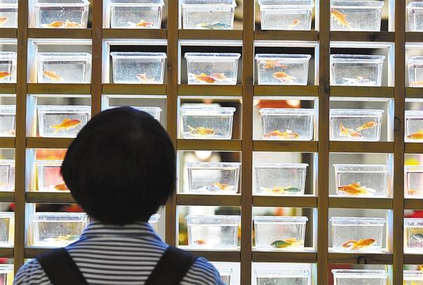 9月23日,观众在金鱼墙前观赏。当日,国潮金鱼博物馆在福建省福州市三坊七巷塔巷正式开馆。博物馆设有“源”“境”“奇”“锐”4个展厅,为金鱼量身定制了形态各异的鱼缸,展出来自国内外约100个品种的3000余尾精品金鱼。