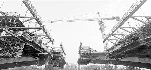 该桥东西两侧引桥采用40m预应力箱梁,全桥40m预制箱梁252片,东侧引桥梁板架设已全部完成,西侧引桥已架设半幅。主桥采用预应力变截面连续现浇梁(78+130+78)m,悬浇段共16个节段,采用四套菱形挂篮;左幅已施工至15号节段,即将开始合拢段施工;右幅已施工至12号节段。