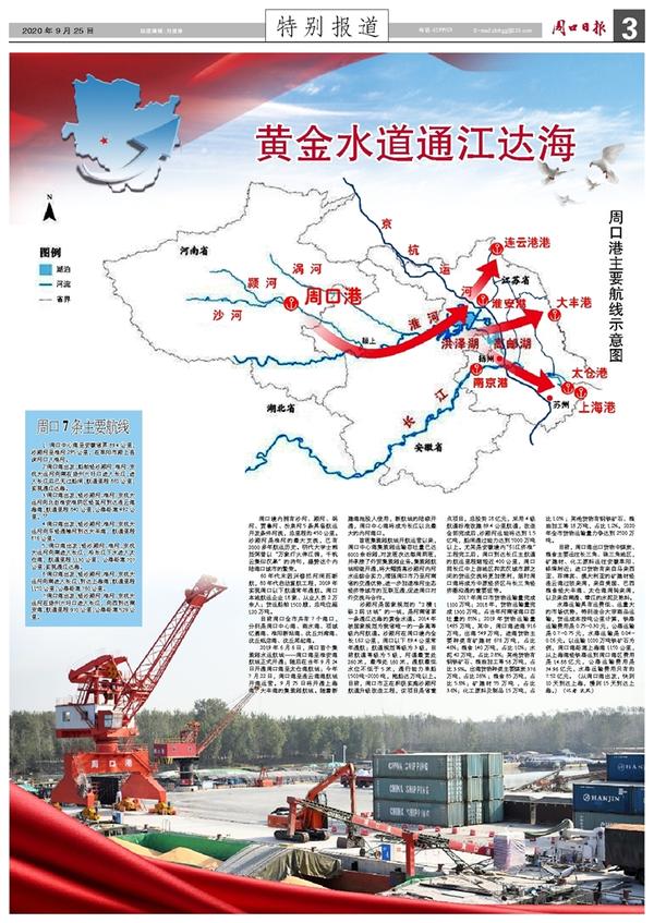 2019年6月6日,周口首个集装箱水运航线——周口港至淮安港航线正式开通;随后在当年9月24日开通周口港至太仓港航线;今年7月22日,周口港至连云港港航线开港运营。9月25日将开通上海港、大丰港的集装箱航线。随着新建港池投入使用,新航线的陆续开通,周口中心港将成为长江以北最大的内河港口。