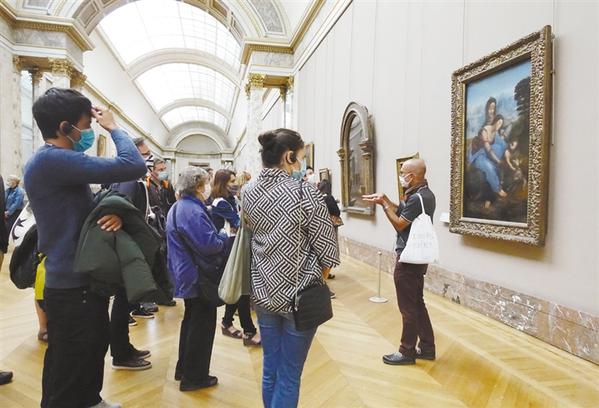 9月25日,人们在法国巴黎卢浮宫欣赏达·芬奇名画《圣母子与圣安妮》。