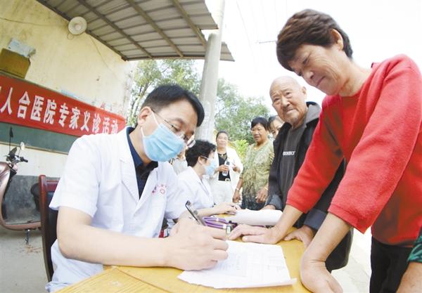 到马营村后,周口人合医院的专家携带仪器、药品,立即投入工作。登记、量血压、测血糖、看眼疾、做彩超、做心电图……村里正值秋收,很多村民听说专家来村里,上门提供健康服务,从地里赶来检查身体。人合医院随行护士还带来疾病预防传单,发给村民,告诉他们怎样养成健康的生活习惯,预防疾病。