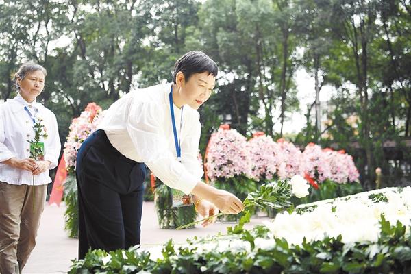 9月30日,在重庆歌乐山烈士陵园,来自重庆市社会各界干部群众500余人参加烈士纪念日活动。这是市民向革命先烈敬献鲜花。