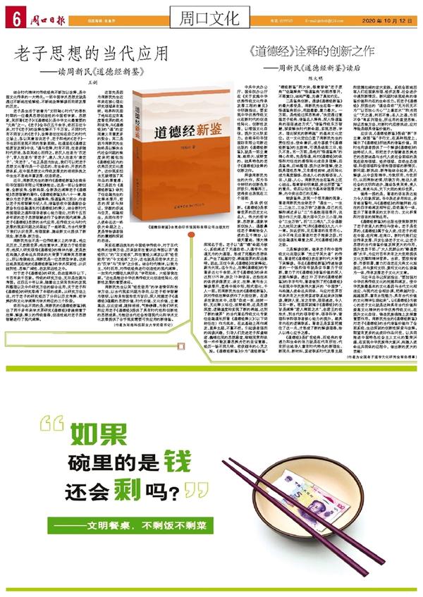 《道德经新鉴》的出版也使我联想到了老子故里人的责任与使命。老子是世界的,《道德经》属于全人类,但老子的根在中国、在河南、在周口。新时代我们应该传承发展、开发弘扬老子文化,让老子思想的当代借鉴价值发挥更大的作用,提升党员干部、广大人民群众的“尊道贵德“水平,为应对百年未有之大变局提供文化支撑和精神营养。当前,要按照省委、市委部署,着力打造老庄元典文化旅游区,并与黄河文明、黄河文化的弘扬融为一体,传承发展老子文化大文章。
