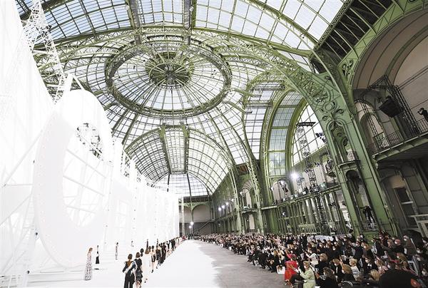 ④ 秀场 10月6日,在法国巴黎大皇宫,模特展示香奈儿2021春夏新品成衣。当日,法国品牌香奈儿2021春夏成衣展在巴黎大皇宫举行。
