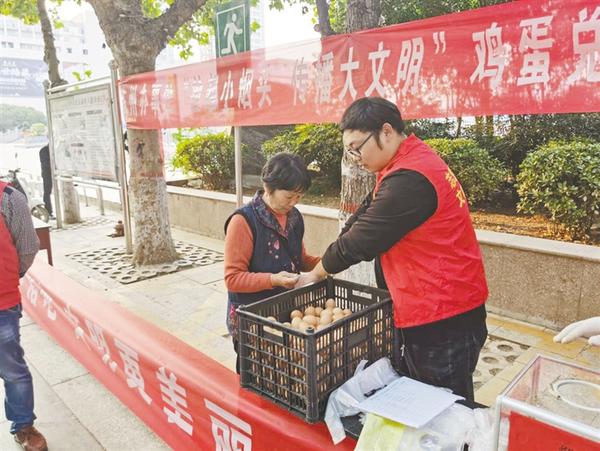 原来这是川汇区陈州办事处在五一广场举办的“捡起小烟头 传播大文明”烟头换鸡蛋活动。该办事处工作人员表示:“五一广场周边人流量大,乱丢烟头现象严重,治理困难,我们很苦恼,于是想出了这个烟头换鸡蛋的妙招,居民可以拿20个烟头换一个鸡蛋。活动的目的就是发动一批人捡拾烟头,影响带动周边的人,让更多的人参与捡烟头,让吸烟的人不好意思丢烟头,增强市民的环保意识和文明意识。”