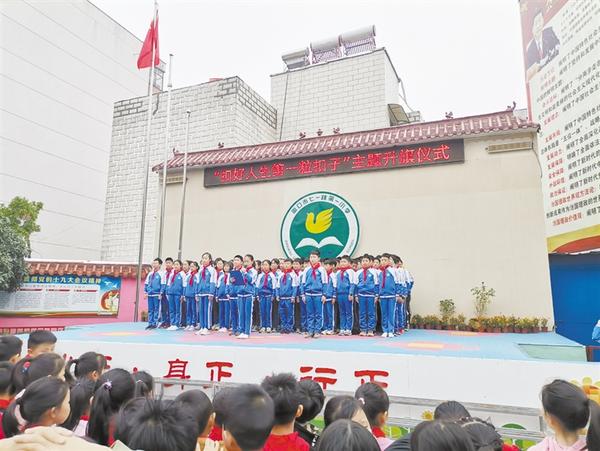 10月12日,周口市七一路第一小学全体师生齐聚校园,隆重举行“扣好人生第一粒扣子”主题升旗仪式。六(2)中队少先队员向全校师生发出倡议,要做文明新风的传播者、文明行为的践行者、文明创建的参与者。记者 王珂 摄