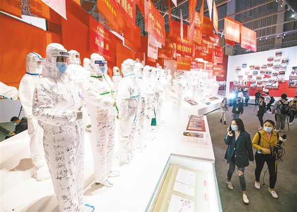 10月15日,人们在抗击新冠肺炎疫情专题展览上参观。当日,“人民至上 生命至上”抗击新冠肺炎疫情专题展览开幕式在湖北省武汉市举行。新华社记者 肖艺九 摄