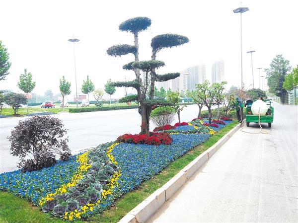红色、黄色、紫色的花儿,还有造型别致的景观树……10月21日,记者在周口中心城区七一东路的一处绿化带内看到一组造型别致的景观造型,扮靓了绿化带,给人耳目一新的感觉。记者 张洪涛 摄
