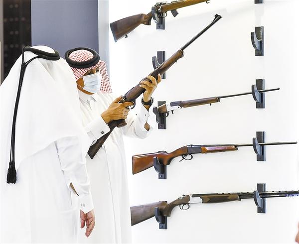 10月22日,在卡塔尔多哈,人们在第四届国际狩猎和猎鹰展上检查猎枪。当日,第四届国际狩猎和猎鹰展在卡塔尔首都多哈的卡塔拉文化村举行,共有来自十三个国家的一百多家公司参加本次为期三天的展会。