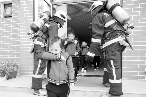 11月2日,胶南中心幼儿园的孩子们在消防员的指导下模拟火灾逃生。当日,山东省青岛市西海岸新区胶南中心幼儿园联合黄岛区消防救援大队海王路消防救援站,为孩子们举办了一场消防安全知识培训活动,帮助孩子树立消防安全意识。新华社发