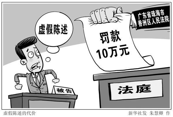 虚假陈述的代价 近日,广东省珠海市香洲区人民法院对一宗服务合同纠纷案中故意作虚假陈述的当事人作出罚款决定:因虚假陈述行为浪费司法资源,妨碍案件审理,妨害民事诉讼,该当事人被罚款10万元。新华社发