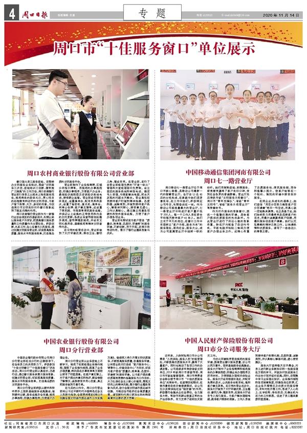 中国农业银行股份有限公司周口分行营业部在总分行的正确领导下,在全体员工的共同努力下,积极参加“十佳文明窗口”“十佳服务窗口”评选活动。周口分行营业部认真组织,迅速行动,通过窗口服务来展示服务形象、创建文明营业部;切实提高服务质量、服务水平和服务效率,打造高品质的文明服务平台。