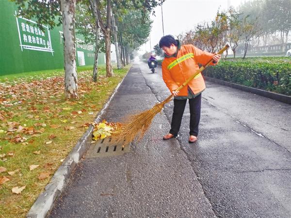 11月17日早晨,下着小雨,记者在周口中心城区七一路东段看到,一名环卫工人正拿着扫帚清扫路面的落叶。向在雨水中值守、默默为城市发展作出贡献的环卫工人致敬。 记者 张洪涛 摄