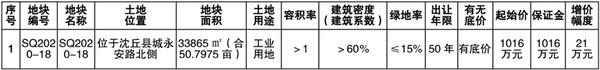 备注:SQ2020-18号:1.宗地“五通一平”(宗地外通路、通电、通讯、通上水、通下水,宗地内土地平整);2.由辖区政府负责按时向受让人交付土地;3.行政办公及生活服务设施用地面积不得超过工业项目总面积的5%;4.准入行业:食品制造业。