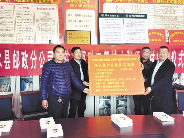 11月20日上午,商水县邮政分公司党支部到结对帮扶贫困村老城办事处大张行政村开展“手拉手”主题党日活动,为该村党员捐赠《习近平谈治国理政》80余册,还为村里新安装路灯50盏,给党员活动室购买一套办公桌椅。 记者 付永奇 通讯员 闫永生 摄