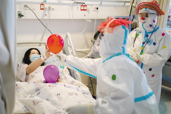11月19日,“医疗小丑”在以色列北部城市采法特的齐夫医学中心新冠治疗科室和病人互动。 新冠疫情期间,以色列医院里被称为“医疗小丑”或“梦想医生”的人在严格的卫生防疫措施下,帮助患者在欢笑中配合治疗,并暂时忘却孤独和痛苦。