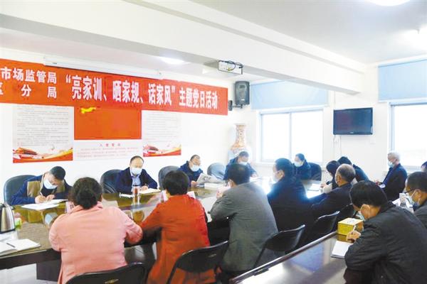 本报讯 (记者 宋风 文/图) 11月17日,周口市市场监管局港区分局组织开展“亮家训、晒家规、话家风”主题党日活动(如图),部分退休老党员老干部、班子成员与全体干部职工参加活动。