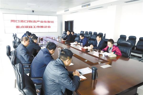 本报讯 (记者 宋风 文/图) 11月16日,周口港区管委会主任程若光主持召开会议,推进港区重点项目建设工作(如图)。港区领导杜广贤、李翔、刘学庆、李素芹出席会议。