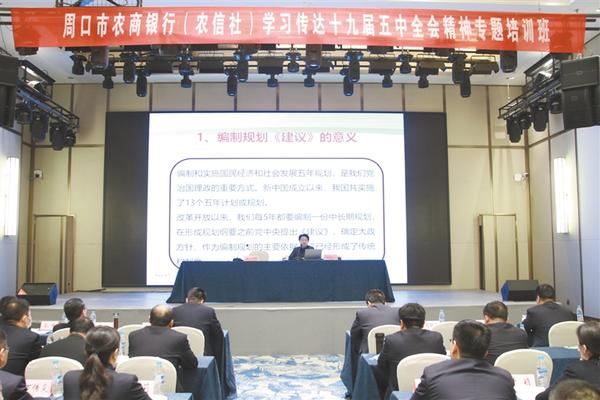 本报讯(记者 张艳丽 通讯员 张艳秋 娄庆波)党的十九届五中全会召开后,周口市农商银行(农信社)第一时间认真学习、深刻领会全会精神, 坚持把学习宣传贯彻全会精神作为当前和今后一个时期的重要政治任务,多措并举在辖内迅速掀起学习宣传贯彻的热潮。
