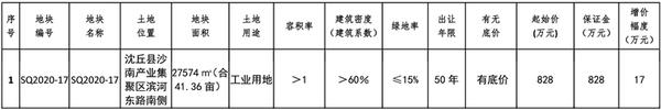 备注:SQ2020-17: 1.宗地“五通一平”(宗地外通路、通电、通讯、通上水、通下水,宗地内土地平整)。2.由辖区政府负责按时向受让人交付土地。3.准入行业:纺织业。4.行政办公及生活服务设施用地面积不得超过工业项目总面积的5%。
