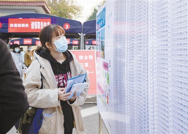 11月29日,考生在南京林业大学考点门前查看考场分布表。当日,中央机关及其直属机构2021年度考试录用公务员公共科目笔试在全国各考区统一举行。新华社发