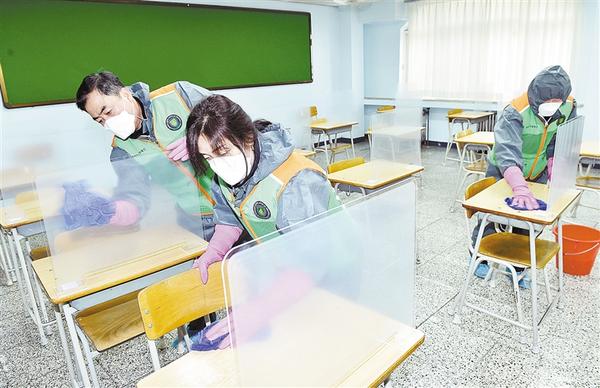 ③ 12月2日,在韩国京畿道城南市,工作人员在设于某高中的高考考点进行消毒作业。新华社发