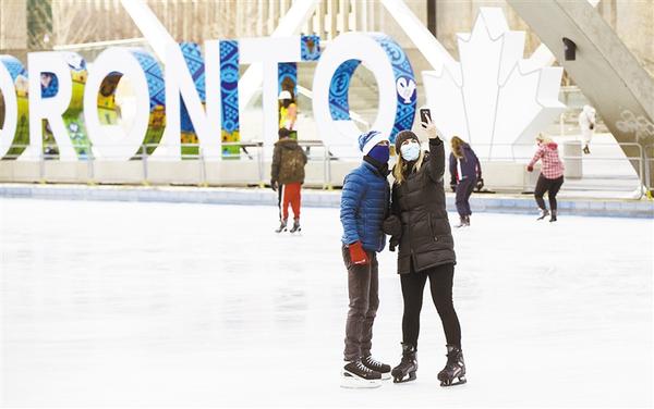 ② 12月3日,在加拿大多伦多,滑冰者在一处室外冰场自拍。截至当日下午,加拿大累计死亡12395例。新华社发