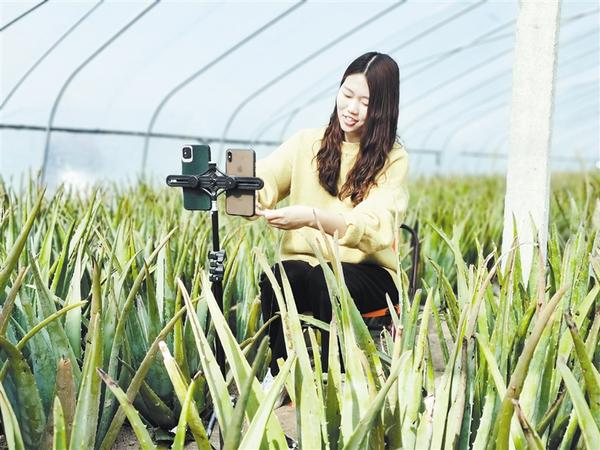 12月7日,川汇区华耀城办事处葛湾行政村的一个芦荟大棚里,“网红”正在进行直播带货。葛湾行政村大力发展芦荟种植产业,成立了专业合作社,全村统一规划,结合市场需求规律,由合作社与企业签订订单或通过电商平台进行网络销售,取得了良好经济效益。如今,芦荟种植已成为当地的特色产业。