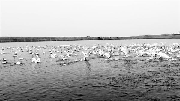 由于生态环境优美、气候适宜,随着季节更替,引黄调蓄湖引来了无数的白天鹅、白鹭、黑头鸭来此驻足,场面异常温馨、壮观。