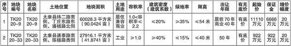 五、拍卖时间及网址 拍卖报价时间为:TK2020-9地块:2020年12月30日10时30分,TK2020-33地块:2020年12月30日10时40分;拍卖网址:周口公共资源交易系统(网址:http://jyzx.zhoukou.gov.cn)。
