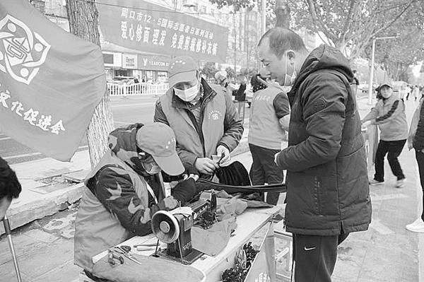 12月6日,周口市慈孝文化促进会、周口环境保护协会的志愿者来到五一文化广场开展免费修补衣裤、爱心理发志愿服务活动。图为活动现场。记者 张洪涛 摄