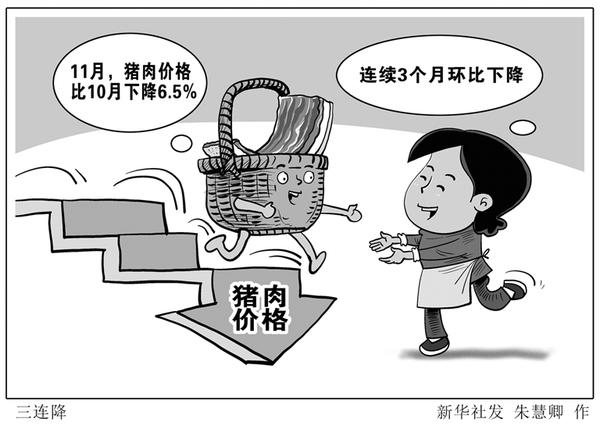 国家统计局9日发布的数据显示,11月,猪肉价格比10月下降6.5%,连续3个月环比下降;与去年11月相比,猪肉价格下降12.5%。