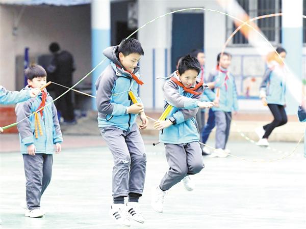12月11日,学生们在大课间进行团队跳绳运动。 近年来,江西省南昌市青云谱区曙光小学引进专业教师,强化大课间与特色体育教学相结合,创立“绳韵”特色课程,打造花样跳绳体育大课间,通过速度跳绳、花样跳绳、团体跳绳等项目,培养学生健康的体魄和团队协作精神。 新华社记者 彭昭之 摄