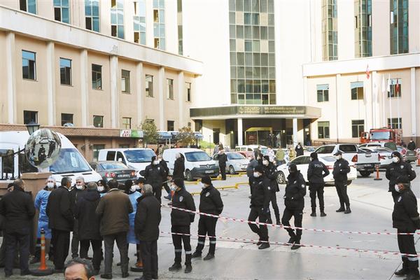12月19日,在土耳其东南部加济安泰普省,警察在发生火灾的私立医院外警戒。加济安泰普省一家私立医院19日发生火灾,导致9名新冠患者死亡。新华社发