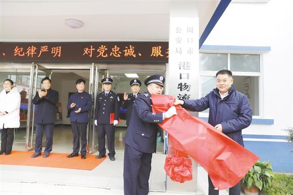 本报讯 (记者 宋风 文/图) 12月17日,周口市公安局港口物流产业集聚区分局正式成立,周口港区党委书记孙红伟,市公安局党委委员、副局长张新奇到场为分局揭牌。港区领导张东立、李翔、刘学庆、李素芹参加揭牌仪式。