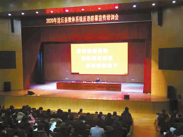 本报讯 (记者 韦伟 文/图) 12月22日下午,沈丘县第一高级中学报告厅内座无虚席,该县600多名学校负责人参加了2020年沈丘县教体系统反恐防暴宣传培训会(如图)。