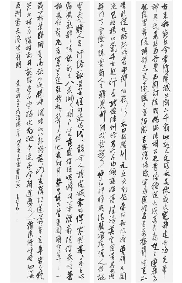 在本次“黄泛区新歌——弘扬黄河文化周口书画作品展”中,李珂用行书四条屏创作的书法作品《寻淮阳》,被收录“城市之光”板块。“‘古来称宛丘,今当淮阳城。上溯六千载,此地已文明……’这首诗是孟庆武先生所作,全文36句共360字。为创作这幅作品,我对这首诗进行了认真反复地研读,然后选用行书四条屏进行创作,其间更是经过了6次反复修改,力争把每一个字都写好,做到诗书统一。”李珂说。