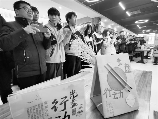 12月28日上午, 淮阳职专和淮阳实验高中的学生们动手绘制的“光盘行动” 创意桌牌在学校餐厅集中展示,吸引了大家的眼球。校长李同森表示,通过活动的开展,引领和教育同学们厉行节约,不浪费粮食,养成文明就餐的好习惯,时刻提醒同学们“聚点滴之俭,添光盘之彩。” 记者 杜欣 摄