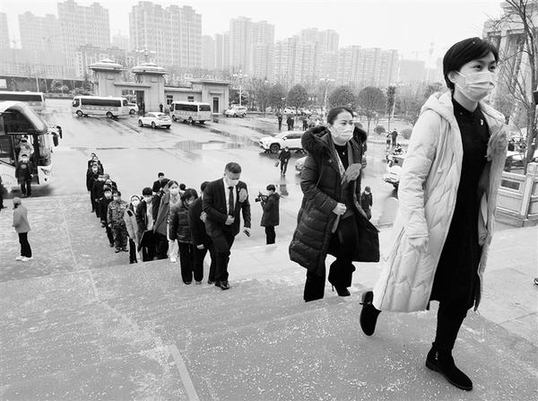 抗击新冠肺炎疫情先进个人、先进集体代表,追授人员亲属代表步入会场。