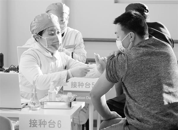 1月3日,在位于北京市西城区广安门外街道红莲社区卫生服务站的接种点,医护人员为接种人员注射疫苗。当日,记者来到北京市西城区、大兴区的新冠疫苗接种点进行探访。据了解,从2021年1月开始,北京市各区对重点接种人群逐批开展新冠疫苗接种工作,预计将于2021年春节前对涉及进口冷链物品的口岸一线海关检验检疫人员,及口岸装卸、搬运、运输等相关人员等9类重点人群完成新冠疫苗紧急接种。新华社记者 张晨霖 摄
