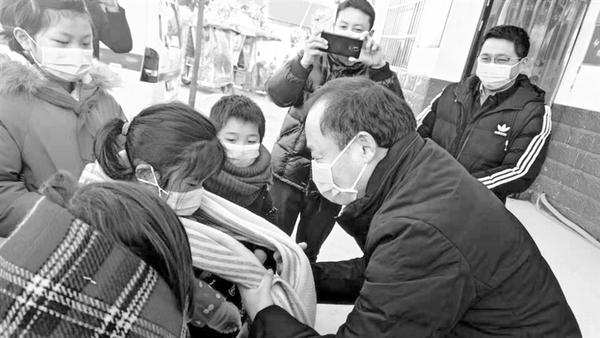 近日,周口市中医院组织医护人员到沈丘县洪山镇石关村开展“传递新希望 助力心温暖”周口市希望工程温暖冬天活动,共为石关村贫困学生捐赠50套棉衣、帽子、手套、围巾等温暖助学物资。图为该院工会主席孙俊为贫困学生系围巾。 记者 李硕 摄