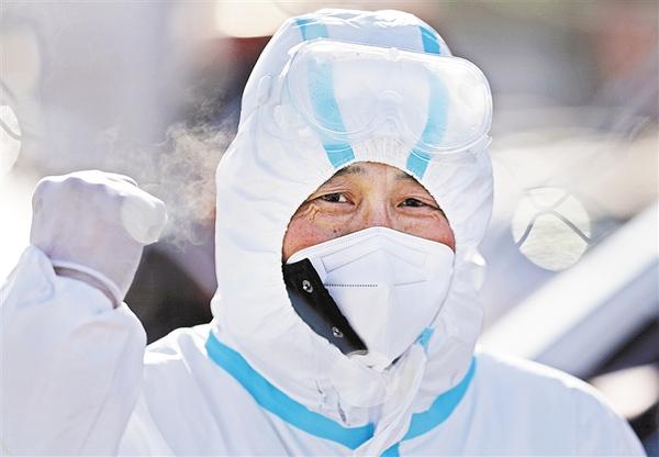 1月7日,在沈阳市皇姑区向工街管控区域出入口处,一位工作人员在寒风中做出了加油的手势。 1月7日,沈阳市迎来入冬以来最低气温,当日最低气温达到零下27摄氏度。在沈阳市疫情中风险地区抗疫一线的工作者们,用各自的奉献与坚守,温暖了这座城市。新华社发