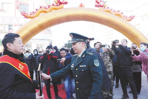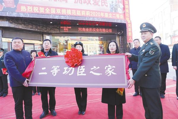 周口军分区副司令员薛振喜、市退役军人事务局局长陈宏为赵莉莉家庭颁“二等功臣之家”牌匾。