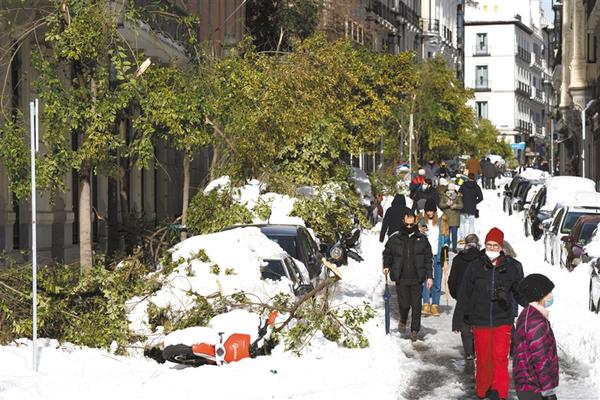 1月10日,在西班牙马德里市中心,被雪压断的树枝砸在路边停放的车辆上。西班牙内政大臣10日说,风暴“菲洛梅娜”带来的暴雪和寒冷天气造成西班牙4人死亡。在受影响最为严重的中部和东部,部分地区积雪厚度接近50厘米;许多树木被积雪压倒,一些道路被阻断;大量运输车滞留在公路上。新华社发