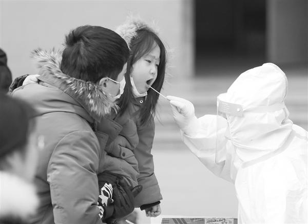 1月12日,医护人员在石家庄市新华区锦绣乾城社区为儿童进行核酸采样。
