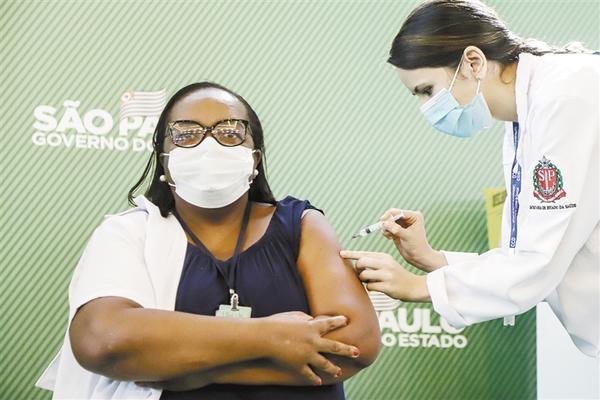1月17日,巴西首名新冠疫苗接种者莫妮卡·卡拉桑斯在圣保罗大学临床医院接种中国新冠疫苗克尔来福。巴西国家卫生监督局17日宣布,给予中国北京科兴中维生物技术有限公司研发的新冠疫苗克尔来福紧急使用许可。巴西首批新冠疫苗接种者当天接种中国疫苗。 新华社发